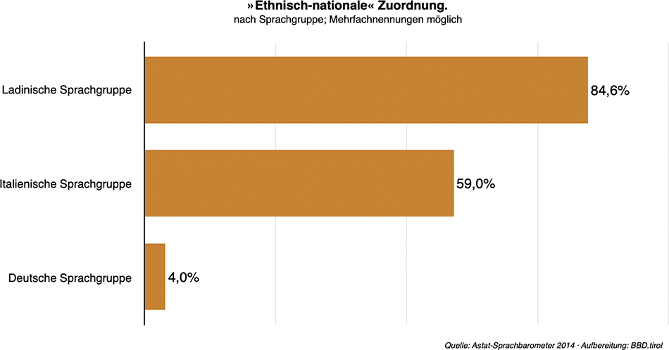 Bei den Ladinerinnen ist die ethnische Identifikation zwar (mit über 80%) am ausgeprägtesten, doch muss man sich hier vor Augen halten, dass in diesem Fall die ethnische bzw. sprachliche und die territoriale Ebene (Ladinien) koinzidieren.