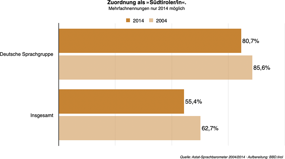 Aufsehenerregend ist jedoch insbesondere die Entwicklung bei der Zuordnung als »Südtiroler/in« im Vergleich zwischen 2004 und 2014: