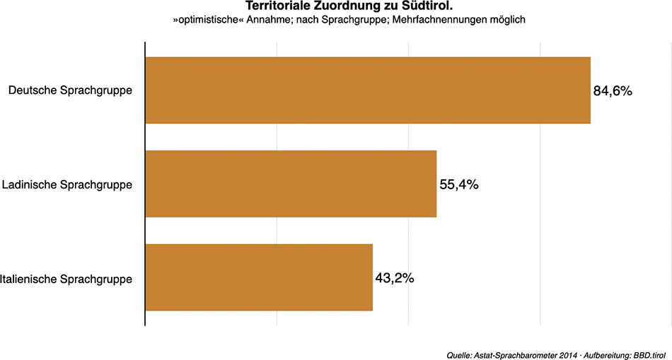 Nur die Mitglieder der deutschen Sprachgemeinschaft identifizieren sich großmehrheitlich mit unserem Land. Aufgrund der Möglichkeit von Mehrfachnennungen ist allerdings selbst hier Vorsicht geboten: Die Grafik zeigt das, was ich eine »optimistische« Annahme nennen würde, also die Summe der Zuordnungsmöglichkeiten »Südtirolerin«, »italienischsprachige Südtirolerin«, »ladinischsprachige Südtirolerin« und »Altoatesina«. Höchstens 84,6 Prozent der Deutschsprachigen, höchstens 55,4 Prozent der Ladinerinnen und höchstens 43,2 Prozent der Italienischsprachigen ordnen sich (mindestens) einer dieser Kategorien zu. Es könnten auch noch sehr viel wenigere sein, die sich jeweils für zwei oder mehr der genannten Zuordnungsmöglichkeiten entschieden haben.