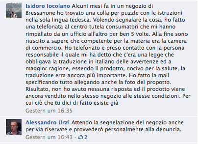 Questi eccessi, per i nostri fautori del plurilinguismo, non sono certo un problema — lo sono, invece, le richieste di parificazione linguistica e di rispetto dello statuto. A tal proposito sul quotidiano A. Adige in data odierna è apparso un articolo pieno di ipocrite preoccupazioni per la salute dei cittadini. Ma solo di quelli di lingua italiana, che, pare al contrario di quelli in lingua tedesca, non sopravvivrebbero alla disponibilità di prodotti etichettati solo nell’altra lingua (accanto a quelli etichettati solo in italiano).