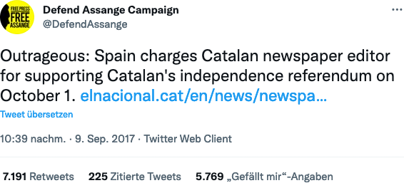 Auf einen ersten Tweet folgte nach einer Stunde ein zweiter, mit dem Assange eine Parallele zwischen der Situation in Katalonien und den Tian’anmen-Protesten herstellte: