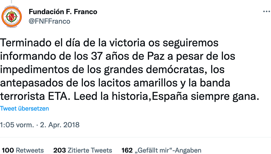 Sobald der Tag des Sieges beendet ist, werden wir euch weiterhin über die 37 Jahre Frieden informieren, [die es] trotz Behinderung durch die großen Demokraten, die Vorgänger der gelben Schleifen [katalanische Unabhängigkeitsbewegung, Anm.] und der Terrororganisation ETA [gegeben hat]. Lest die Geschichte, Spanien gewinnt immer.