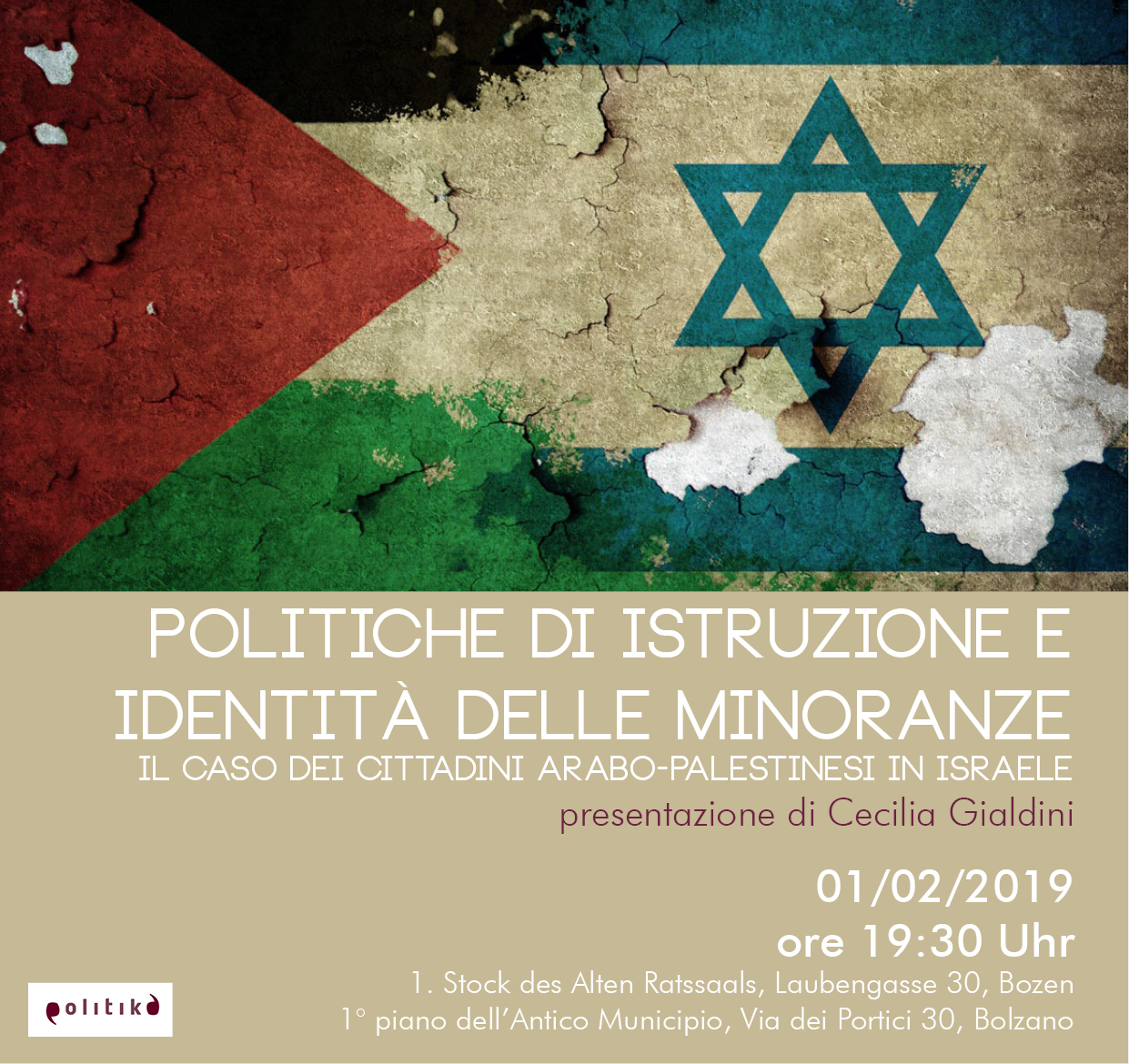 Im Anschluss an die Generalversammlung der Südtiroler Gesellschaft für Politikwissenschaft | politika findet heute Freitag, 2. Februar 2019, ab 19.30 Uhr im Alten Rathaus in Bozen ein Vortrag von Cecilia Gialdini zu Bildungs- und Identitätspolitik von Minderheiten am Beispiel der Palästinenserinnen in Israel statt. Der Vortrag ist in italienischer Sprache.
