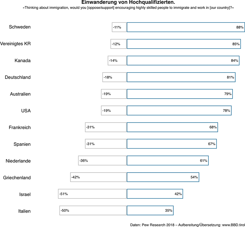 Nur in Israel (42%) und Italien (35%) kann sich weniger als die Hälfte der Bevölkerung für die Einwanderung von qualifizierten Fachkräften erwärmen. Rund die Hälfte der Befragten sprach sich sogar explizit dagegen aus.