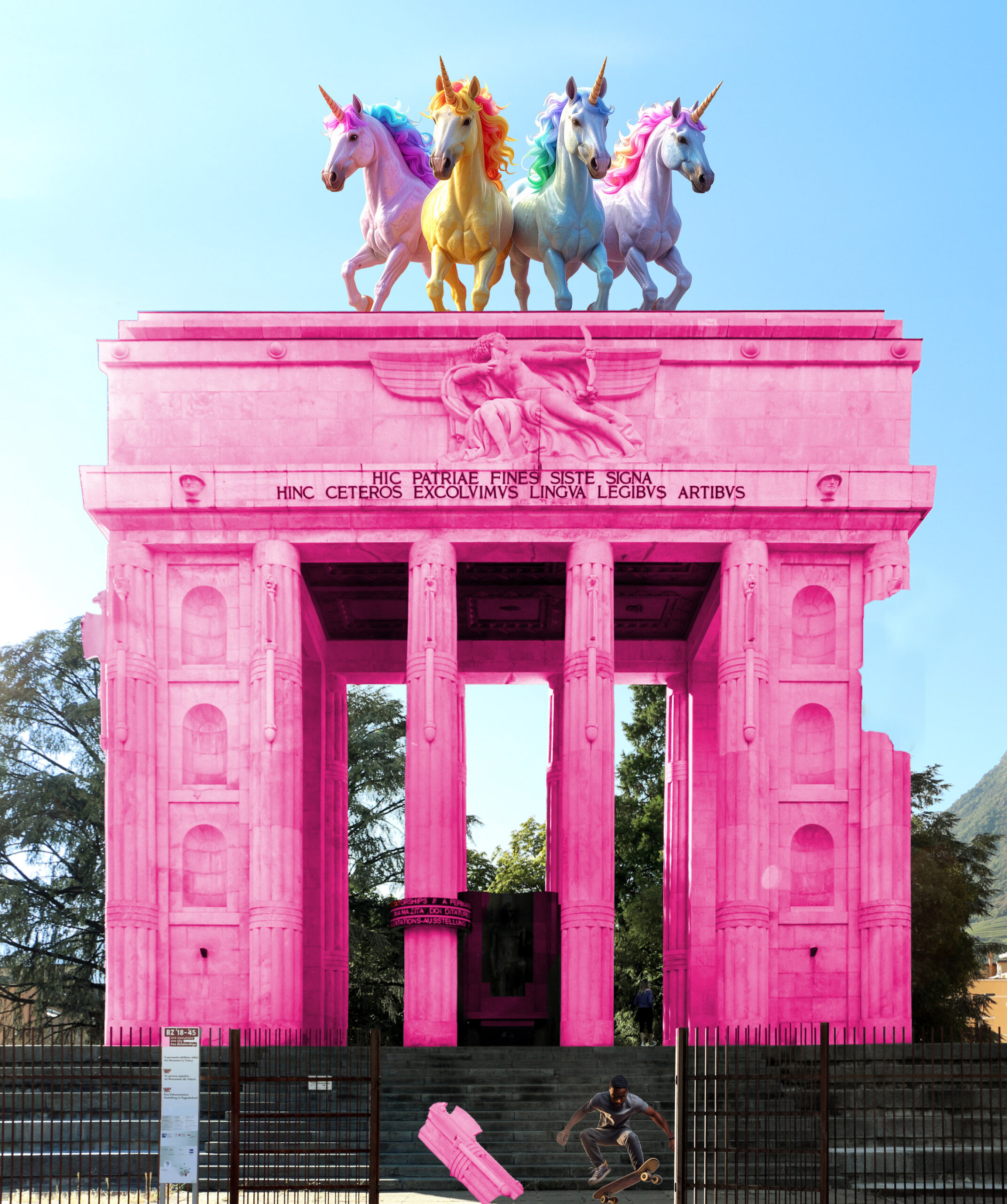 Beschämenderweise ist über Jahrzehnte – vom unrühmlich ausgegangenen Friedensplatz-Intermezzo abgesehen – bezüglich Geschichtsaufarbeitung rund um das Siegesdenkmal nichts weitergegangen, obwohl Bozen immer von Mitte-Links regiert wurde. Man kann sich leider des Eindrucks nicht erwehren, dass es die deutschnationalen Kräfte und Nostalgiker in Südtirol gebraucht hat, um Bewegung in die Sache zu bringen. Allen anderen war das Eisen zu heiß, was einiges über den Status totalitärer Ideologien hierzulande aussagt. Meine persönliche Vision für den “Bogen der Schande” wäre übrigens kein Abriss, sondern die folgende: Die Liktorenbündel werden abgeschlagen und in Trümmern am Boden unter dem Denkmal liegen gelassen, um den Fall des Faschismus zu symbolisieren. Zusätzlich wird das Denkmal komplett in rosarote Farbe getüncht und oben drauf wird eine Quadriga aus regenbogenfarbenen Einhörnern gesetzt. Die Treppen werden Teil eines Skateparks, der das Denkmal umgibt.