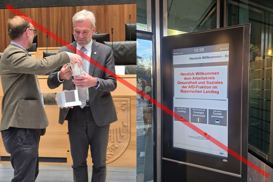 Auch diese inkohärente, opportunistisch gewählte »rote Linie« der Südtiroler Mehrheitspartei war jedoch nicht zu halten: Vor wenigen Tagen, am 3. November, empfing nämlich Landtagspräsident Arnold Schuler (SVP) offiziell eine Delegation der bayrischen AfD-Landtagsfraktion, die sich auf einer »Informationsreise« in Südtirol befand.