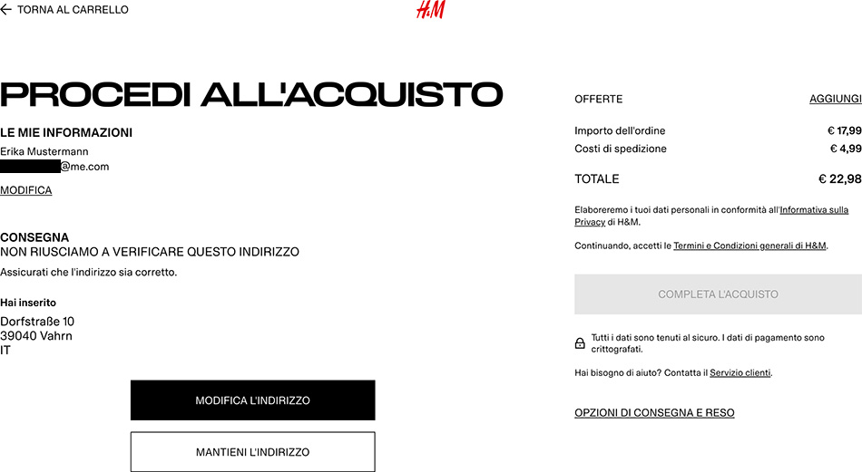 Die einzige Möglichkeit, sich die Ware doch noch zuhause zustellen zu lassen, ist eine Rückkehr zur Adresseingabe, wo man wohl oder übel eine italianisierte Anschrift angeben muss. Denn H&M verschickt prinzipiell — also auch auf Risiko des Bestellenden — nicht an Anschriften, die das System nicht kennt.
