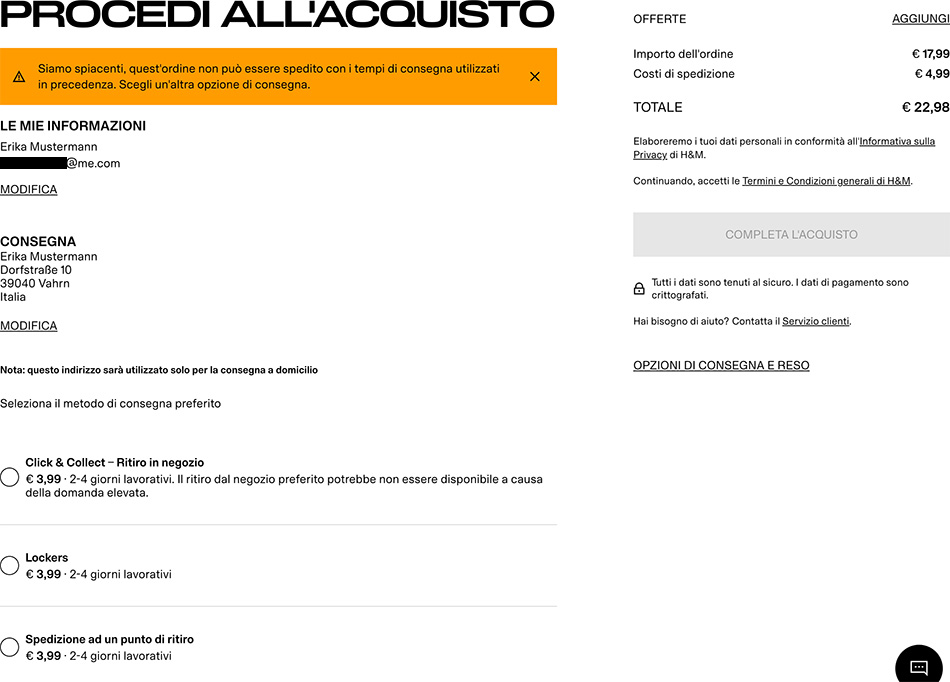 Auch die H&M-Seite erkennt die eingegebene Adresse, obwohl sie existiert, nicht und bietet an, sie entweder zu ändern oder auf sie zu beharren. Tut man Letzteres, wird jedoch nicht (wie von anderen Anbietern gewohnt) die Sendung an die ursprünglich eingegebene Anschrift versendet, sondern es erscheint ein Hinweis, dass die Bestellung mit den »zuvor benutzten Lieferzeiten« nicht verschickt werden könne: