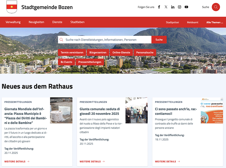 Website der Gemeinde Bozen – Ausschnitt (20. November 2025)