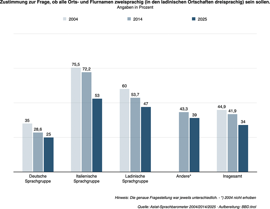 Die Überzeugung, dass Orts- und Flurnamen in Südtirol einer eigenen Version in allen Amtssprachen bedürfen, hat zwischen 2004 und 2025 deutlich abgenommen. Dies ergibt sich aus dem Vergleich des neuen Sprachbarometers 2025, das vorgestern vom Landesstatistikinstitut (ASTAT) veröffentlicht wurde, mit den Erhebungen von 2004 und 2014.
