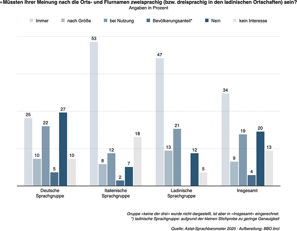 Während sich eine relative Mehrheit (34%) der Gesamtbevölkerung noch immer für die Übersetzung aller Ortsnamen ausspricht, finden 20 Prozent der Befragten Doppel- und Dreifachnamen gar nicht (mehr) nötig. Die angebotenen Zwischenlösungen nach unterschiedlichen Kriterien wie Nutzung (19%)1»Nur wenn die Namen tatsächlich von der Bevölkerung benutzt werden«, Größe (9%)2Übersetzungen »ja, außer in den kleineren Ortschaften« und Bevölkerungsanteil (4%)3»Nur wo die italienische Sprachgruppe einen gewissen Prozentanteil erreicht« kommen gemeinsam auf weitere 32 Prozent.