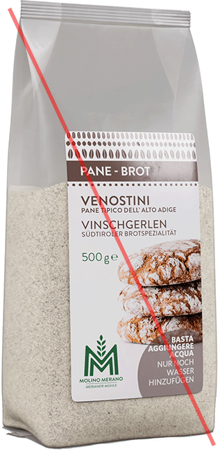 Diese fragwürdige Übersetzung, für die keinerlei Bedarf bestand, wird zudem nicht etwa untergeordnet angeführt, sondern auf der Verpackung — einschließlich faschistisch oktroyierter Landesbezeichnung — prominent, erstgereiht und fett hervorgehoben. Die Originalbezeichnung »Vinschgerlen« erscheint demgegenüber lediglich zweitgereiht und in kleinerer Schrift.