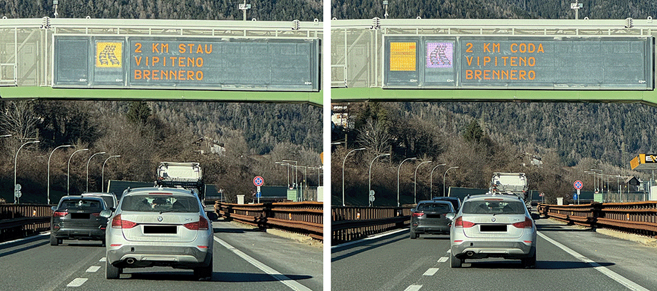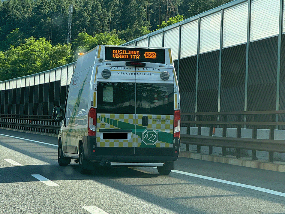 Seit einigen Monaten wird das Display der stehenden oder fahrenden Fahrzeuge jedoch üblicherweise nicht mehr abgeschaltet. Stattdessen ist dort dauerhaft die Bezeichnung ausiliari traffico – A22 eingeblendet. Dass dabei offenbar vergessen wurde, abwechselnd sowohl die italienische als auch die deutsche Bezeichnung anzuzeigen — was technisch problemlos möglich wäre —, muss wohl ein ganz seltenes Versehen sein.